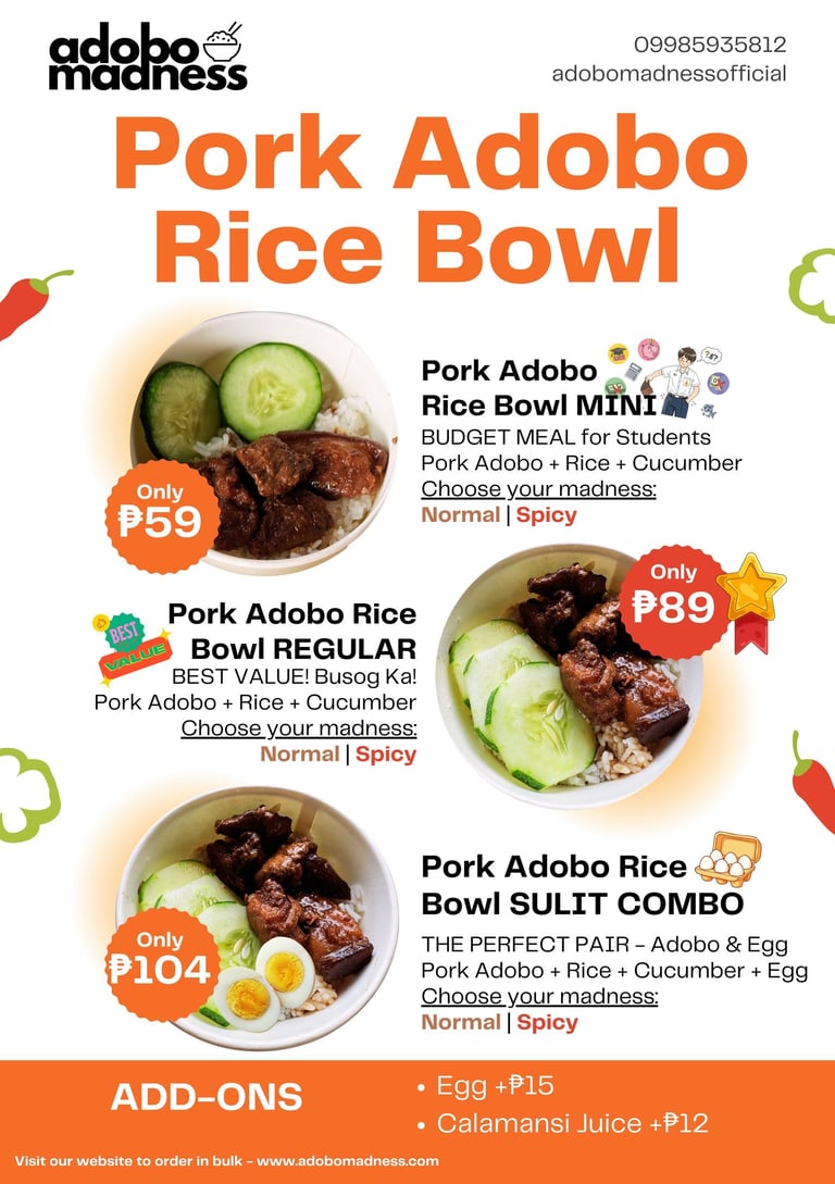 Look for our mobile store in your area around lunch and dinner to buy our pork adobo rice bowls on the spot. Usually, we will be at SLSU Tomas Oppus from 10:30AM - 12:30PM.