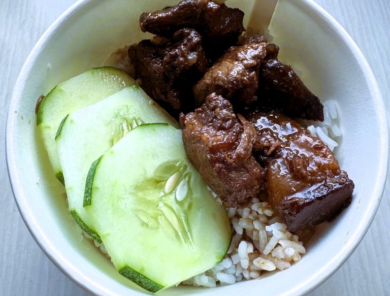 Enjoy the comforting Filipino dish that layers tender, slow-braised pork in a rich, savory sauce of soy sauce, vinegar, garlic, and black pepper over a bed of warm steamed rice. The pork is deeply flavorful----salty, tangy, and slightly garlicky----with the sauce soaking into the rice for extra depth in every bite. Finished with a side of cucumber slices, it's a simple yet satisfying bowl that balances bold adobo flavors with the softness of rice. You can also enjoy it with egg and/or our freshly made and refreshing calamansi juice.
